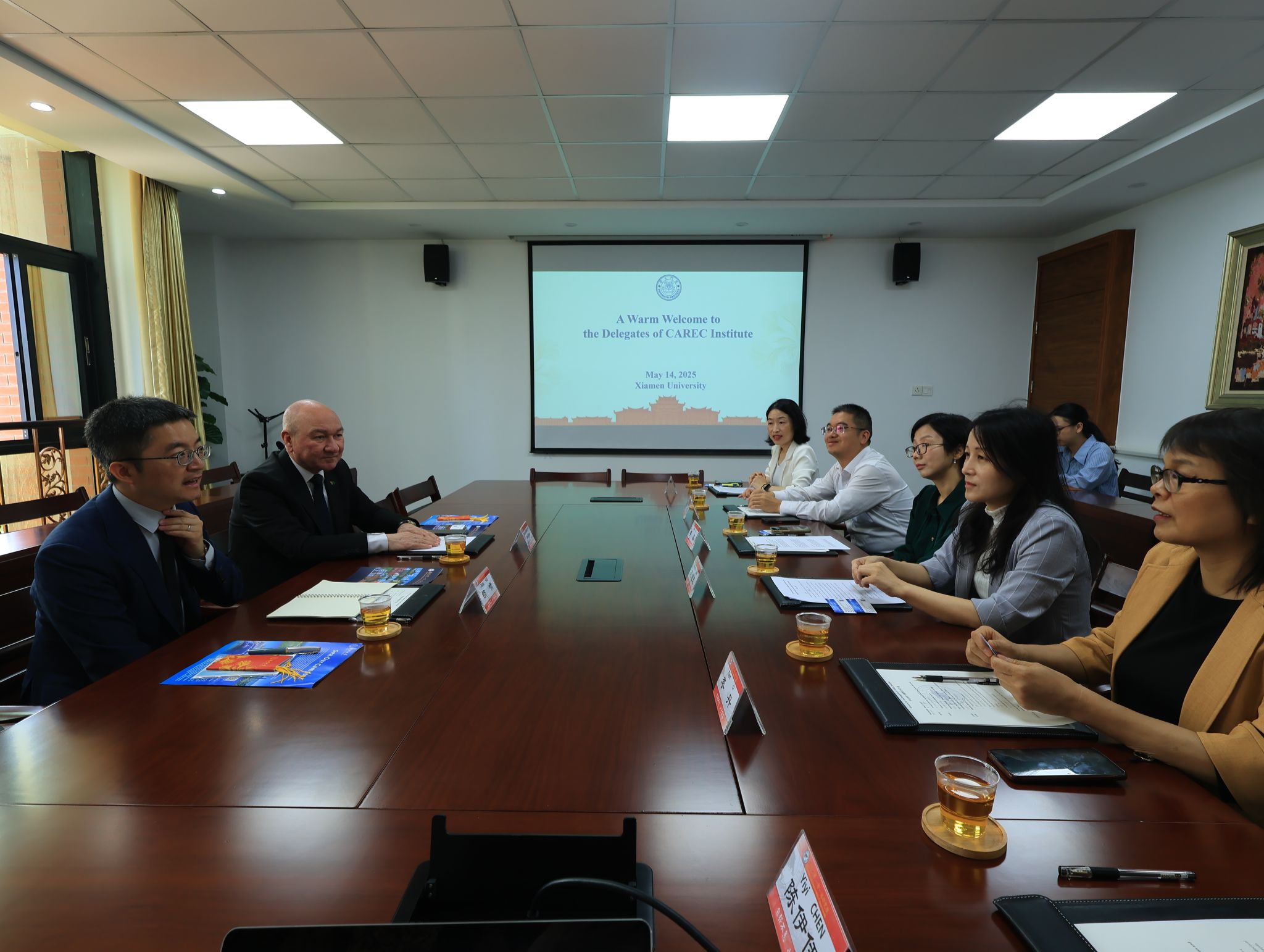 2025年5月14日上午,中亚区域经济合作学院院长查里穆哈梅特·沙利耶夫、人事财务及行政处处长胡啸来访厦门大学,与一带一路研究院专家学者进行座谈交流。国际合作与交流处副处长刘婉玉主持座谈会。公共事务学院教授李丹,研究生院培养与管理办公室副主任、管理学院教授张博,知识产权研究院助理教授李晶,一带一路研究院办公室主任宋阳出席本次座谈。