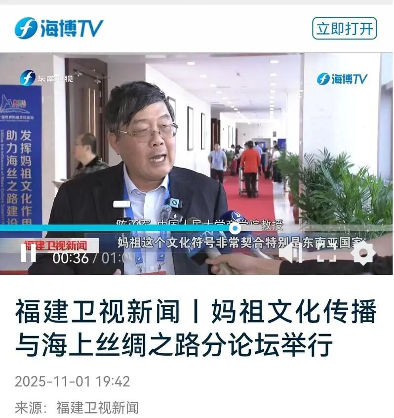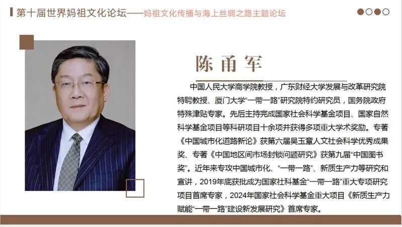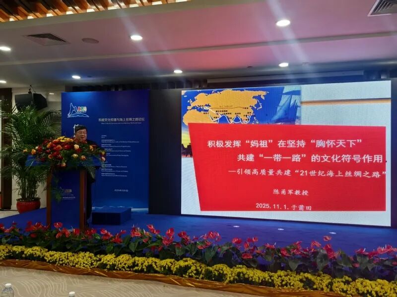 2005年10月31日~11月2日。第十届世界妈祖文化论坛在福建省莆田市湄洲岛举行。厦门大学一带一路研究院特约研究员、广财财经大学发展与改革研究院特聘教授、国家社科基金重大项目《新质生产力赋能“一带一路”建设新发展研究》首席专家陈甬军应邀与会观礼参加活动,并于11月1日下午在妈祖文化与21世纪海上丝绸之路发展分论坛上发表演讲,介绍了项目研究的最新成果,观点获得与会代表的高度评价,并由福建卫视采访后在当天新闻联播节目播出。