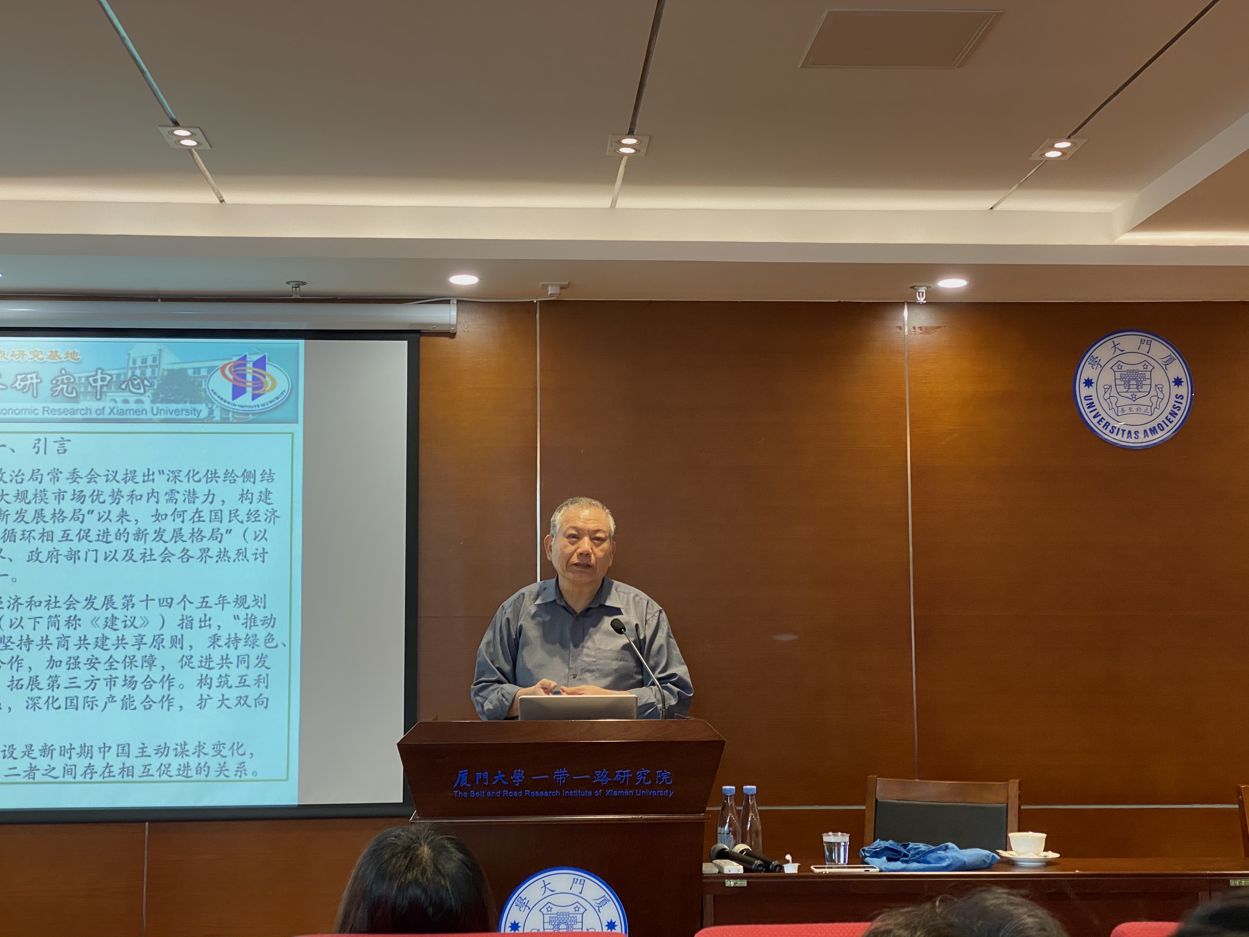 2021年4月14日上午,厦门大学特聘教授,原厦门大学经济学院副院长李文溥在嘉庚四号楼420一带一路研究院报告厅,做了题为“‘一带一路’建设与构建国内国际双循环的新发展格局”学术讲座。本场学术讲座由厦门大学一带一路研究院常务副院长陈武元教授主持。