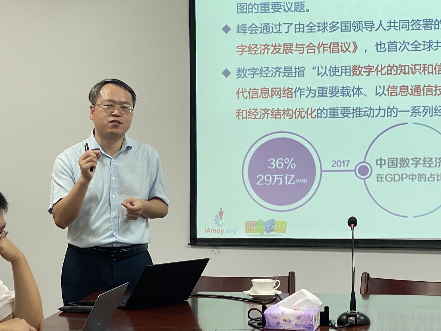 2021年7月27日上午,厦门大学航空航天学院自动化系副教授洪文兴在嘉庚四号楼一带一路研究院会议室做了题为“技术视角下的数字经济观察——以‘数字丝路创新服务平台’的策划和研发为例”的学术讲座。本场讲座由厦门大学一带一路研究院常务副院长陈武元教授主持。