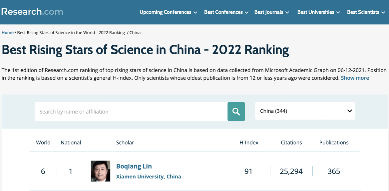 2022年11月,全球权威科学研究网站Research.com发布了2022年度科学新星(Rising Stars of Science)名单。厦门大学一带一路研究院能源经济研究中心主任、管理学院中国能源政策研究院院长林伯强教授荣登榜单,在榜单中排名世界第6,中国第1。Research.com本次公布的科学新星排名基于全球所有领域166880名科学家在Google Scholar和Microsoft Academic Graph中的数据,包括H指数、在该学科内的贡献、所获奖项和成就,仅评选首篇英文学术文章发表时间在近13年之内的科学家。Research.com是全球科学研究的主要网站之一,自2014年以来提供有关科学贡献的可靠数据。