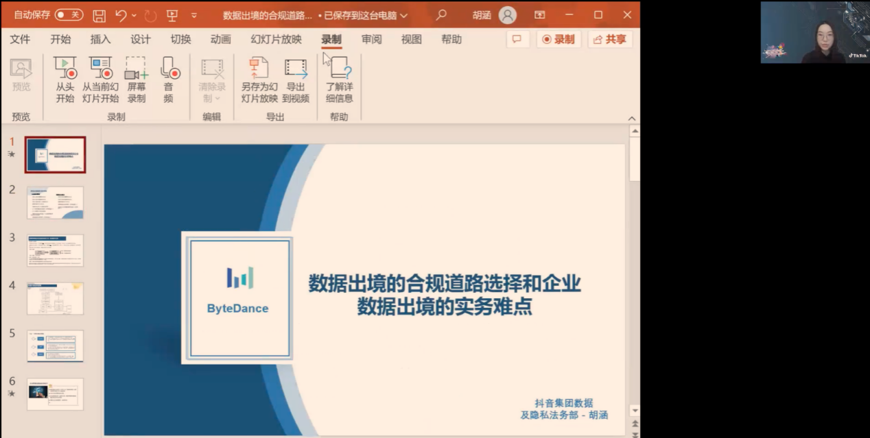 抖音集团数据及隐私法务副总监胡涵以“数据出境的合规道路选择和企业出境的实务难点”为题,分析我国数据跨境流动的基本立场,并从企业视角探究数据出境合规流程、我国“三选一”的数据出境合规道路之间的区别性和关联性,以及企业在数据出境活动中面临的实务难点。
