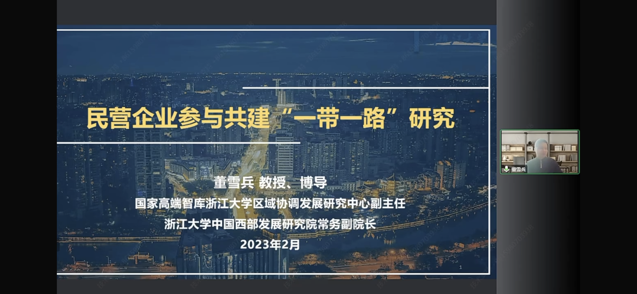 2023年2月23日上午,浙江大学区域协调发展研究中心副主任、中国西部发展研究院常务副院长董雪兵教授在线上做了题为“民营企业参与‘一带一路’建设研究”的学术讲座。本场讲座由一带一路研究院副院长蔡庆丰教授主持,通过厦大群贤平台在线上同步直播。