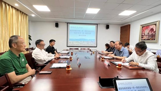 陈武元向翟东升介绍了一带一路研究院的建设发展情况。陈武元说,厦门大学一带一路研究院成立于2017年,经过六年精心建设,现如今已有9个研究中心,确立了7大研究方向和“五个一”建设目标,即每年举办一个发展论坛、研发一个营商环境指数、建立一个数据库、出版一本年鉴、设立一个编辑部。目前研究院已经成功举办了3届厦门大学“一带一路”发展高端论坛、组织了88期的每周学术讲座并形成了3种智库专报。其中,研究院已向一带一路建设促进中心提供了65期智库专报,为国家发改委推进“一带一路”建设贡献了厦大智慧。希望一带一路建设促进中心继续支持研究院工作,为研究院建设、研究提供宝贵的指导意见,推动厦大一带一路研究院发展再上一个新的台阶。