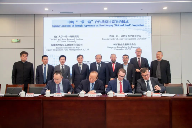 接着,匈牙利企业发展基金会、匈牙利央行智库—约翰·冯·诺伊曼大学欧亚中心、福建海丝股权投资基金管理有限公司、厦门大学一带一路研究院在全国政协丝路规划研究中心领导和匈牙利代表团、申港证券股份有限公司、厦门市各相关单位以及厦门大学领导的共同见证下签署了四方战略合作协议。