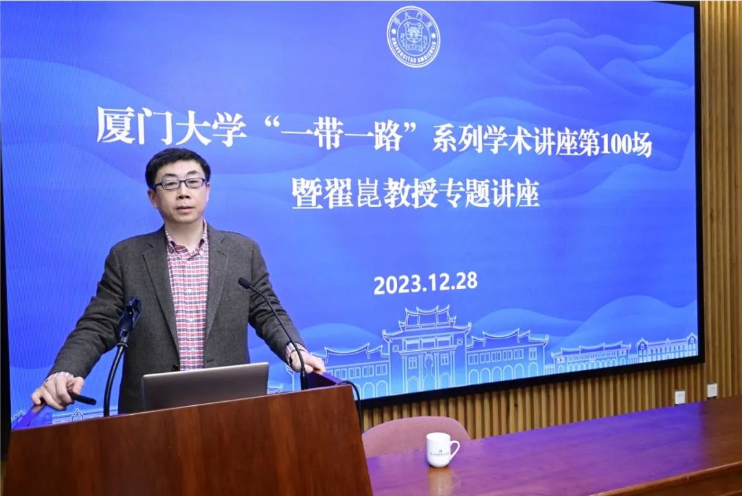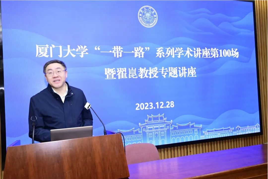 2023年12月28日上午,厦门大学一带一路研究院系列学术讲座暨翟崑教授专题讲座在科艺中心一楼1号会议厅成功举办。本场讲座由厦门大学一带一路研究院常务副院长陈武元教授主持。讲座采取线上线下相结合的方式,在厦大群贤视频号上同步直播。厦门大学副校长方颖教授,《厦门大学学报(哲学社会科学版)》编辑部主任黄寿峰教授,厦门大学校友总会秘书长王智兰博士,知识产权研究院院长林秀芹教授,国际关系学院副院长(主持工作)高艳杰教授,一带一路研究院副院长蔡庆丰教授、李丹教授,发展规划办公室副主任、航空航天学院洪文兴教授,国际关系学院吴崇伯教授,管理学院张博教授,知识产权研究院王俊副教授、董慧娟副教授等作为嘉宾出席。