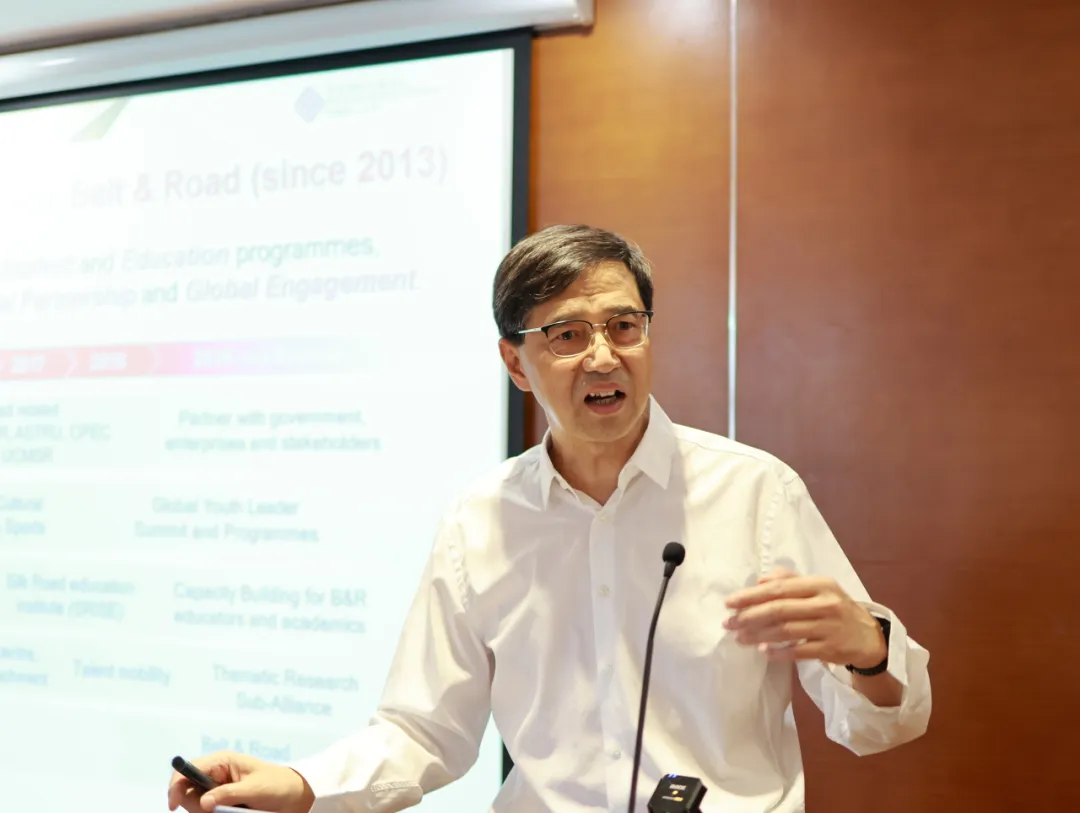 最后,沈岐平教授总结道,在深入推动“一带一路”倡议的历程中,不仅需要协同各项相关活动以增强国际化和国家参与度,还需要深化与“一带一路”大学联盟的交流与合作,共同开发创新的学生互动、研究协同及人才流动项目,为未来培养更多具有国际视野的复合型人才。展望未来,沈教授特别寄语在场师生“Passion, People, Planning, Perseverance”四个关键词。他认为,只有怀揣对事业的无限热情(Passion),汇聚各方精英与人才的智慧与力量(People),制定明确且具前瞻性的规划(Planning),并在面对挑战时保持不屈不挠的毅力(Perseverance),我们才能更好地把握‘一带一路’带来的机遇,共同书写更加辉煌的篇章,为构建人类命运共同体贡献智慧与力量。
