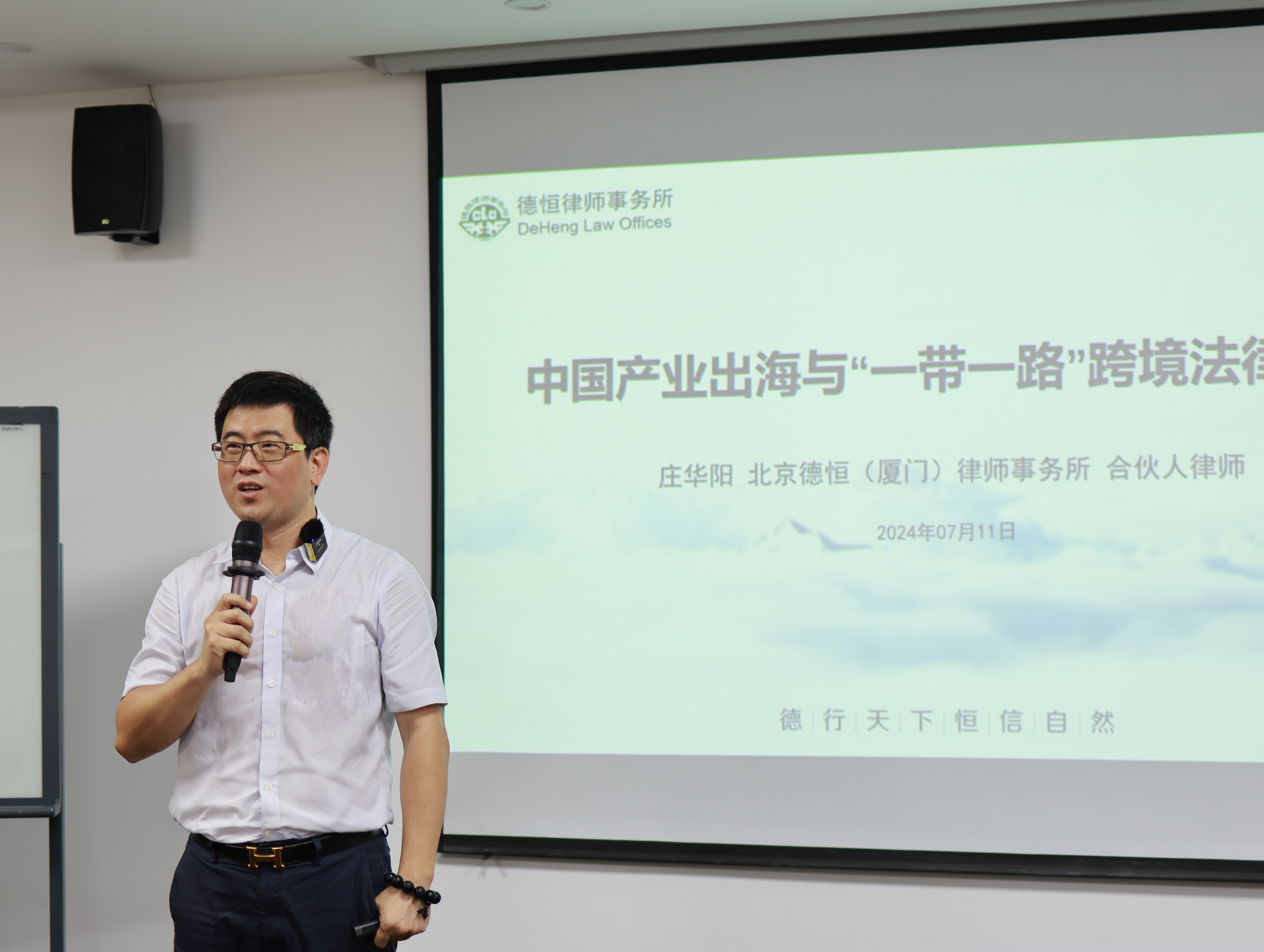 2024年7月11日上午,全国工商联并购公会常务理事、全联并购公会海西并购俱乐部执行秘书长、福建省产业海外发展协会秘书长、北京德恒(厦门)律师事务所合伙人庄华阳律师,北京德恒(厦门)律师事务所合伙人、福建省涉外律师人才库成员戴伟斌律师,应邀在厦门大学一带一路研究院分别做了题为“中国产业出海与‘一带一路’跨境法律服务”“中资企业赴境外投资的合规治理”的主题讲座。本场讲座由厦门大学一带一路研究院常务副院长陈武元主持。讲座采用线上线下相结合的方式,在厦大群贤视频号上同步直播。