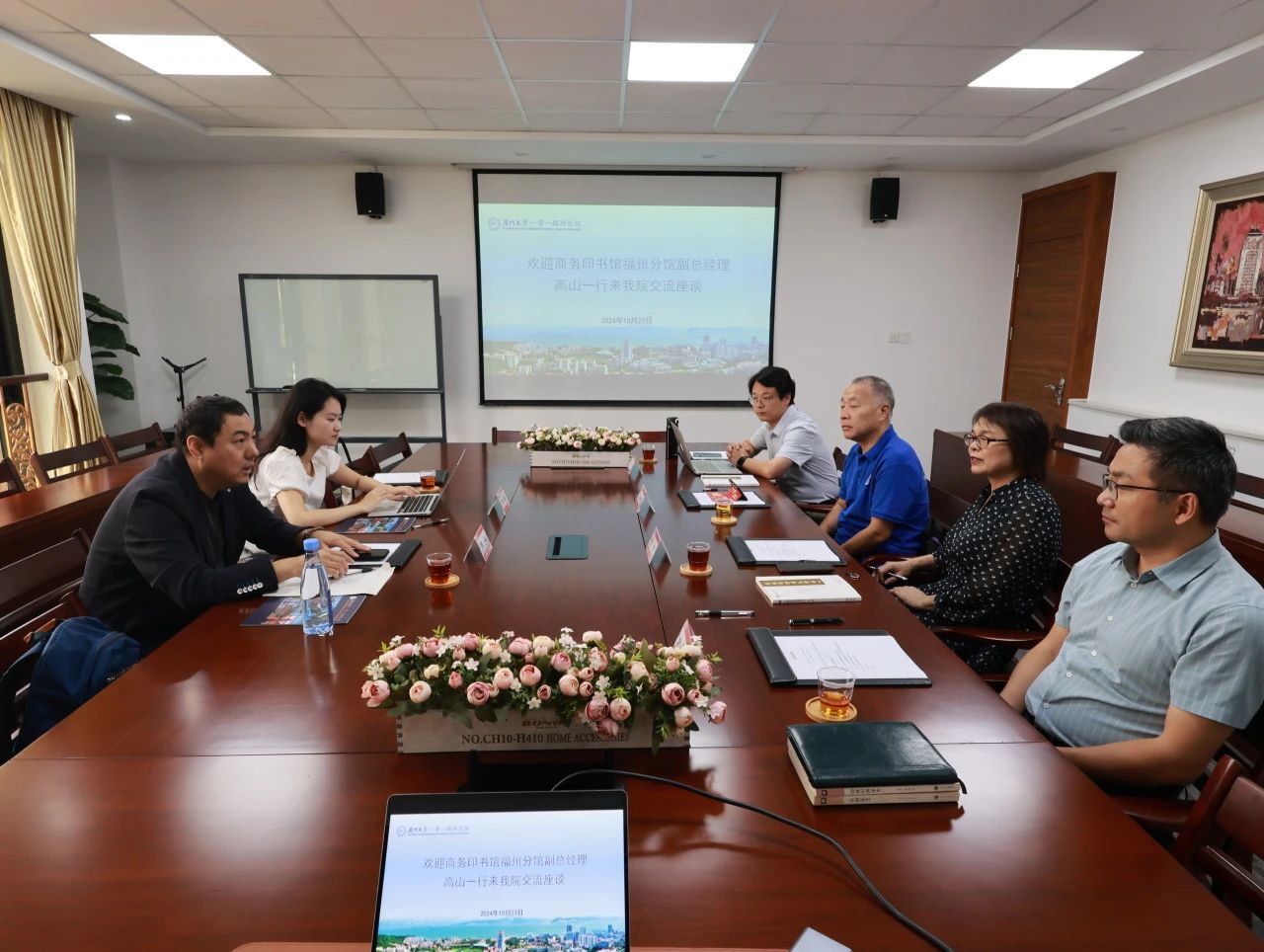2024年10月23日上午,商务印书馆福州分馆副总经理高山、策划编辑曹天爱一行到访厦门大学一带一路研究院。一带一路研究院人类命运共同体研究中心负责人、公共事务学院教授李丹,国际关系学院/南洋研究院副教授、国际关系系主任赵海立,一带一路研究院兼职研究员、国际关系学院/南洋研究院副教授刘计峰,一带一路研究院兼职研究员、国际关系学院/南洋研究院助理教授李峰会见了高山一行。李丹教授主持座谈会。