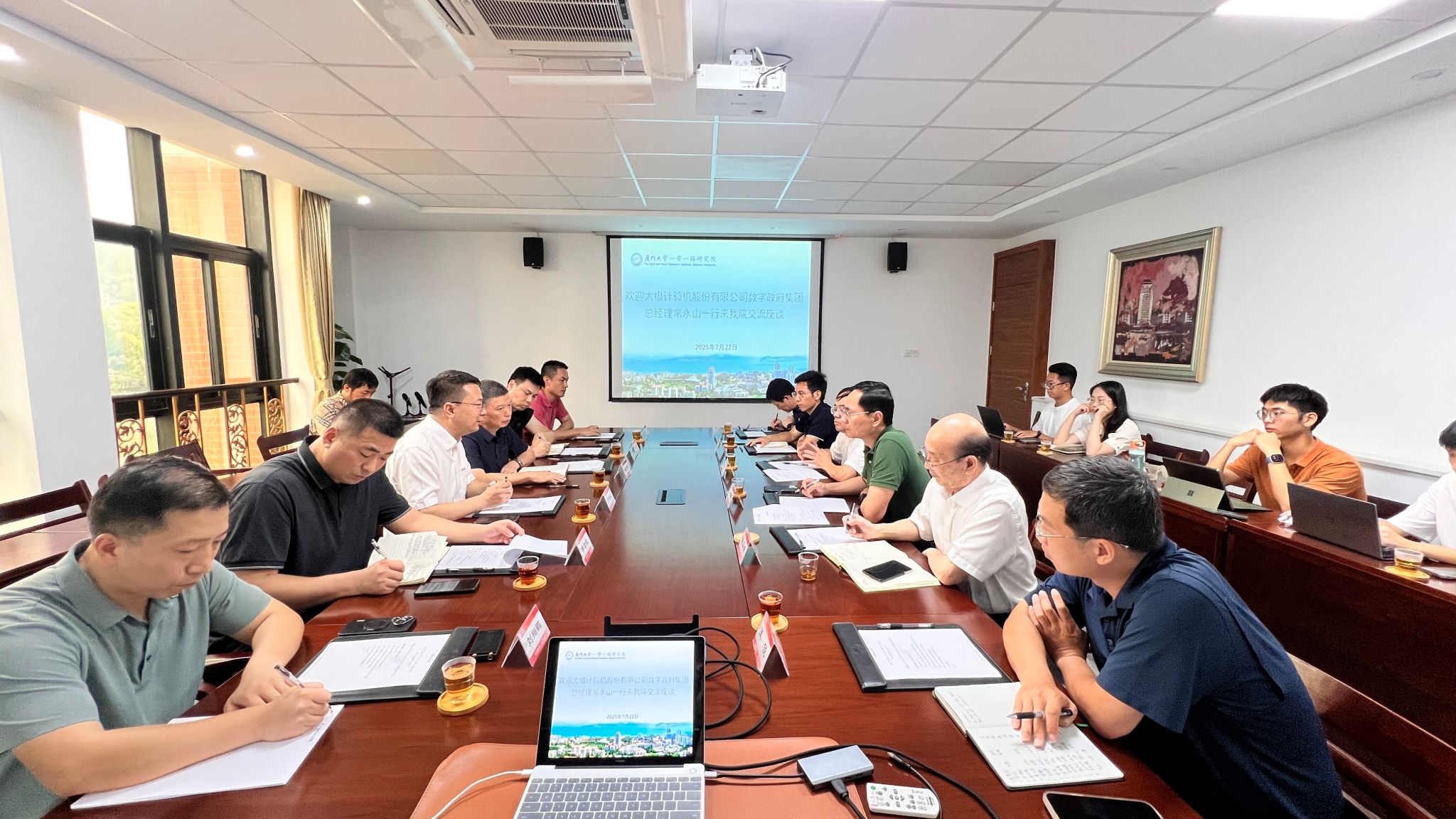 2025年7月22日下午,中电太极计算机股份有限公司数字政府集团总经理常永山一行访问厦门大学。厦门大学党委常委、副校长吴超鹏教授会见来宾。一带一路研究院副院长、经济学院教授蔡庆丰主持会议。经济学院教授朱孟楠、管理学院副教授肖金利、知识产权研究院副教授王俊、管理学院助理教授赖国伟作为学者代表参与本次座谈交流。厦门市湖里区人大常委会副主任傅芳槐与湖里区金砖数字街区相关干部出席本次活动。