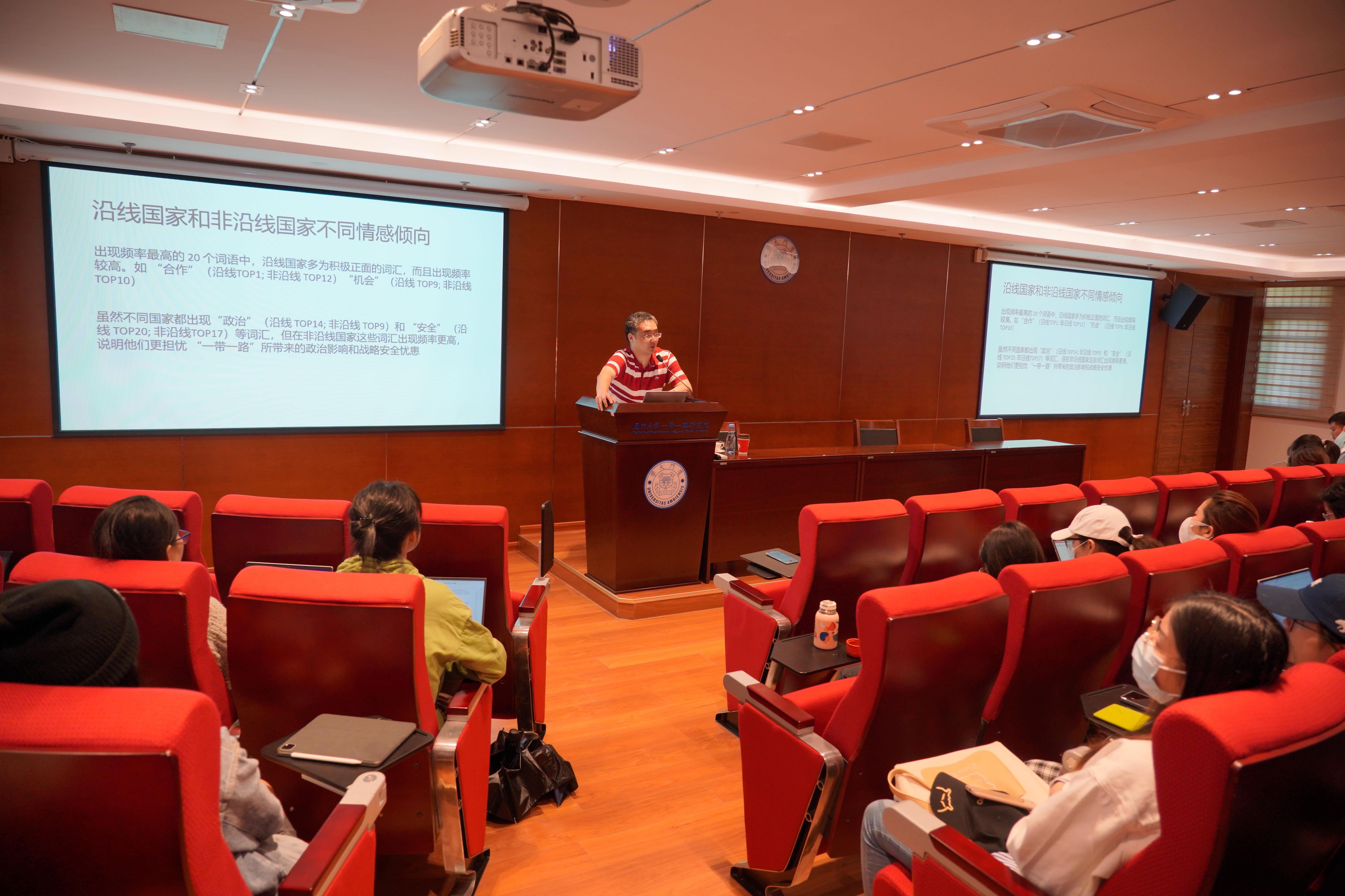 讲座反响热烈,现场来自不同专业的中外籍师生与宣老师进行了积极互动,就“机器学习与词典法在情感分析中的差异”“中国在今后与美国印度等非沿线大国的关系”“跨文化交流中保持独立或融入他者”等问题做了深入交流。陈武元教授对讲座进行了总结,他肯定了宣老师的研究在“一带一路”倡议传播实践中的重要性,并结合自身留学经历与国际教育研究,强调新闻传播学、教育学及所有人文社会科学都可以从文化的视角分析“一带一路”倡议。他希望宣老师能够在科研上再创新高,也勉励同学们提高现实观察力,做出扎实又灵动的研究。