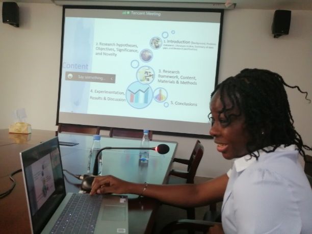 第一个汇报题目为“评估太平洋鲍鱼(Haliotis discus hannai)及其杂交种对盐度压力的反应”,由海洋和地球科学学院的Grace A. Boamah博士对盐度变化对鲍鱼种群及其对水产养殖的影响进行分析。